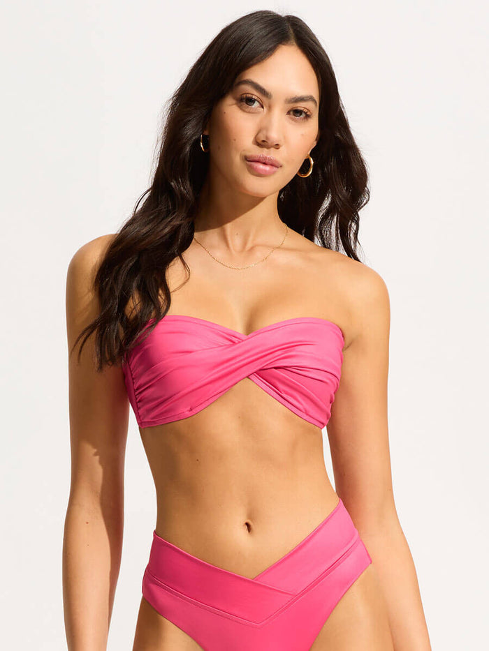 Add some sizzle to your summer with a little lustre! The Soleil Twist Bandeau in Hot Pink from Seafolly is a classic, strapless sweetheart neckline in with twist front detailing, side boning for support, and a clip back closure. Perfect for catching some rays (no tan lines!) or feeling one with the ocean.