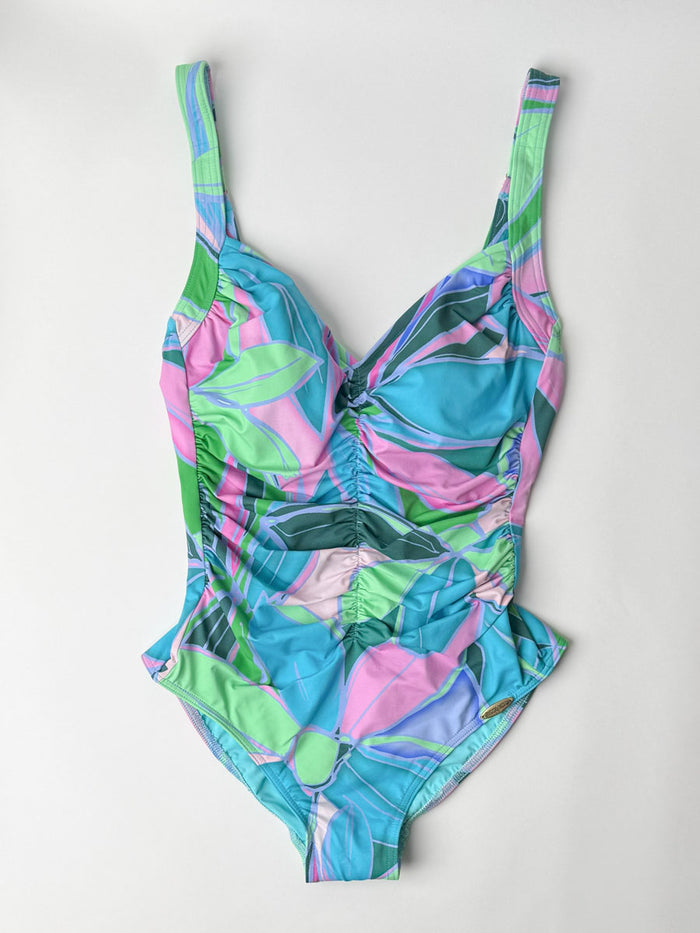 A print of colourful foliage decorates this swimsuit from Sunflair. This one piece features a sweetheart neckline with a figure flattering ruched front, adjustable straps, a shelf bra, and sewn-in bust cups
