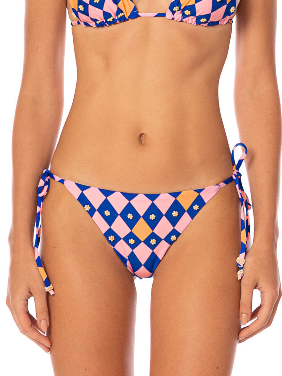 Accentuate those curves in the Sunning Bottom in Like A Diamond from Maaji. This low rise, tie side bikini bottom is perfect for catching some rays or splashing in the waves. Add a flirty touch to your beach look in this cute and colourful diamond print with subtle bead embellishments.