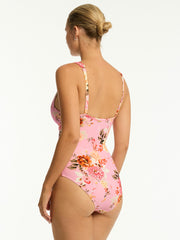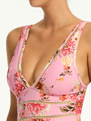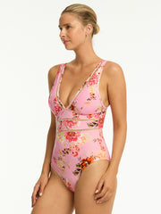 A flattering V neckline and flirty stretch ladder trim are the stars of this comfy yet stunning one piece from Sea Level. The Rosewood Spliced One Piece in Pink features removable cups, adjustable straps, and powermesh support at the front and back for that sleek physique!