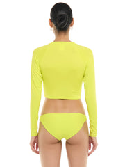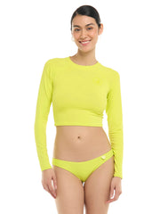 This long sleeve rash guard features a cropped fit, crew neckline, and is made of UPF 50 fabric to protect you from the harsh rays of the sun. Whether you're in the water or on dry land, the Body Glove Let It Be Rash Guard in Key Lime is the ideal companion for all of your Summer time adventures.