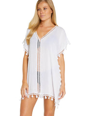 Effortless and breezy kaftan perfection! The Moroccan Kaftan in White from Baku is a short, lightweight cover up featuring a V neckline, ladder lace detail, and fringe pom pom trim. This fabulous piece is a customer favorite and an essential for all of your seaside and pool side escapades!