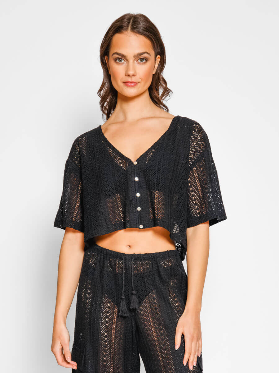 This may be the cutest top to hit our shelves yet! The Amalfi Top in Black is an allover crochet, cropped, short sleeve, V neck top with buttons down the front. This sweet little top looks adorable paired with the matching cargo pants or with denim, skirts, the possibilities are endless! Boho dream vibes included.