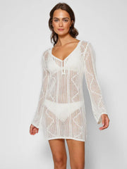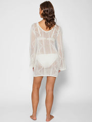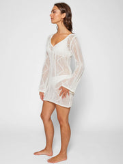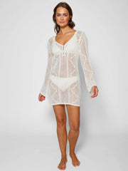 Embrace the goddess within you in the Santorini Crochet Tunic in Cream from Koy Resort. Drawing inspiration from the stunning landscapes of Greece, this tunic dress is crafted from soft semi-sheer knit crochet offering a breezy and stylish appearance. Featuring a V neckline, long bell sleeves, and a mini length it transitions seamlessly from a beach cover-up to a chic evening dress. Its casual, comfortable design makes it ideal for packing along on all your adventures, ensuring you stay effortlessly fashionable wherever you go.
