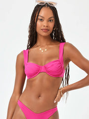 The Stella Top in Bougainvillea from L*Space features the support of an underwire bra with wide, comfy shoulder straps, a 3 point hook back closure, and flattering ruching on the cups for that extra bit of oomph!