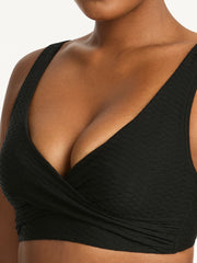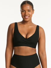 We love the fit and feel of this flattering bikini top from Sea Level and if you love a supportive top without an underwire this is for you! The Honeycomb Cross Front Multifit Top in Black features a cross front V neckline, built in soft bust cups for shaping, adjustable, convertible straps, and a honeycomb textured fabric that is quite frankly, the bees knees! Lined with Powermesh support, this top provides comfortable smoothing and shaping for a beautiful silhouette.