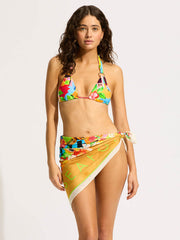 Colorful imagery of vacations abroad decorate this stunning scarf from Seafolly. The Cuba Scarf Scarf in Turquoise is a small size, square scarf in a silky soft fabric that can be worn multiple ways. An effortlessly chic piece to add to your upcoming vacation looks.